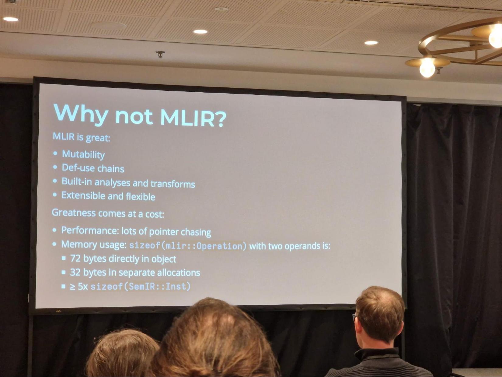 Those intrigued by MLIR internals should definitely catch the second conference keynote on Efficient Idioms in MLIR. The keynote delved into performance comparisons of different MLIR primitives and patterns. It gave developers a good intuition about the costs of performing operations such as obtaining an attribute or iterating or mutating the IR. On a similar topic, the talk Deep Dive on Interfaces Implementation gave a better insight into a cornerstone of MLIR genericity. These interfaces empower dialects to articulate common concepts like side effects, symbols, and control flow interactions. The talk elucidated their implementation details and the associated overhead incurred in striving for generality.