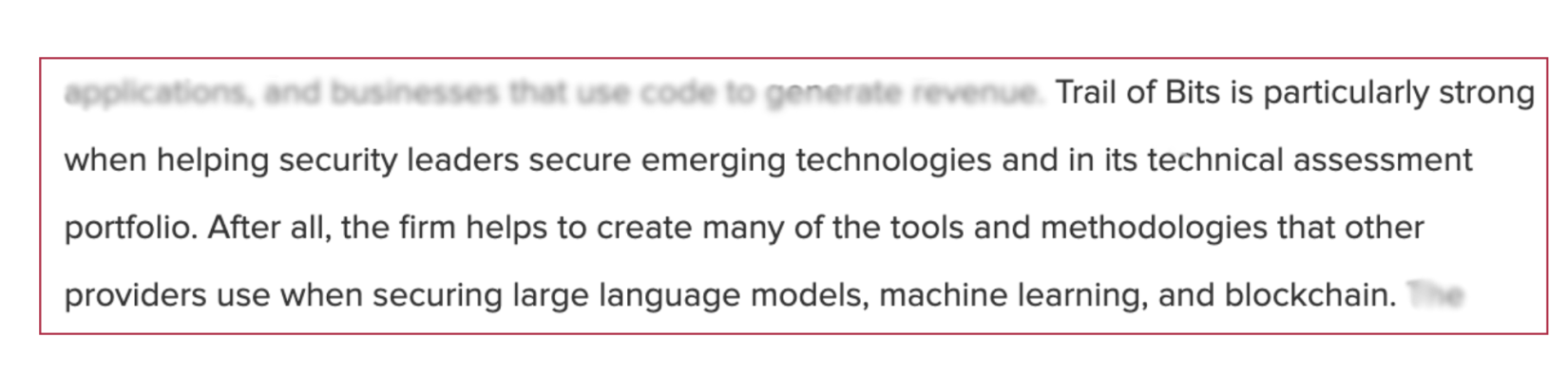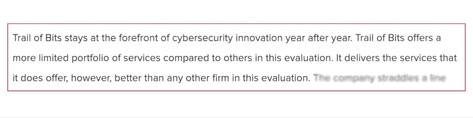 Trail of Bits has been recognized as a leader in cybersecurity consulting services according to The Forrester Wave™: Cybersecurity Consulting Services, Q2 2024. In this evaluation, we were compared against 14 other top vendors and emerged as a leader for our services.