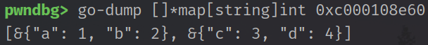 That’s why I created the go-dump command. Using the Go compiler’s source code as a reference, I implemented dumping for all of Go’s built-in types, including integers, strings, complex numbers, pointers, slices, arrays, and maps. The built-in types are notated just like they are in Go, so you don’t need to learn any new syntax to use the command properly.