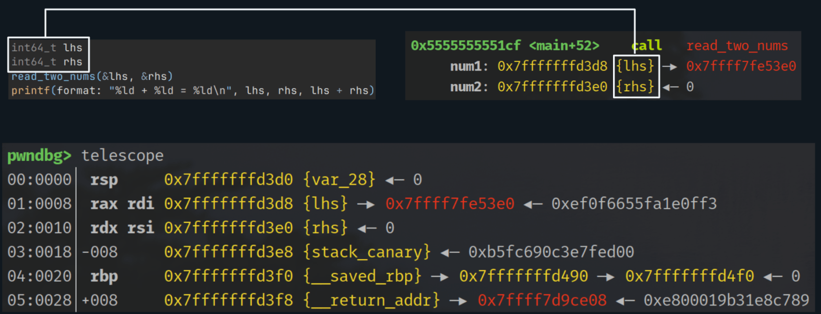 The most involved component of the integration is syncing stack variable names. Anywhere a stack address appears in Pwndbg, like in the register view, stack view, or function argument previews, the integration will check if it’s a named stack variable in Binary Ninja. If it is, it will show the proper label. It will even check parent stack frames so that variables from the caller will still be labeled properly.