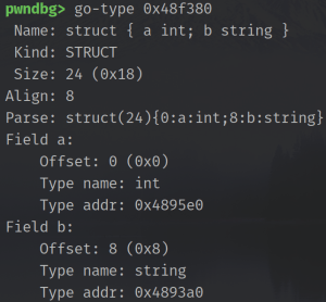 I wrote a parser capable of recursively extracting this information in order to process type information for arbitrarily nested types. This parser is exposed via the go-type command, which displays information about a runtime type given its address. For structs, this information includes the type, name, and offset of every field.